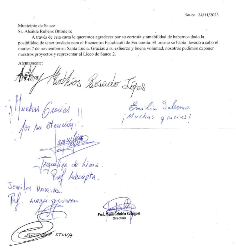 El Municipio de Sauce muestra su agradecimiento al Liceo Nro. 2 – Grupo de Economía por la nota de agradecimiento recibida, en reconocimiento a la colaboración proporcionada para el traslado al Encuentro Estudiantil de Economía que se realizó el martes 7 de noviembre en Santa Lucía. El Municipio se complace en continuar respaldando a las Instituciones Educativas.
